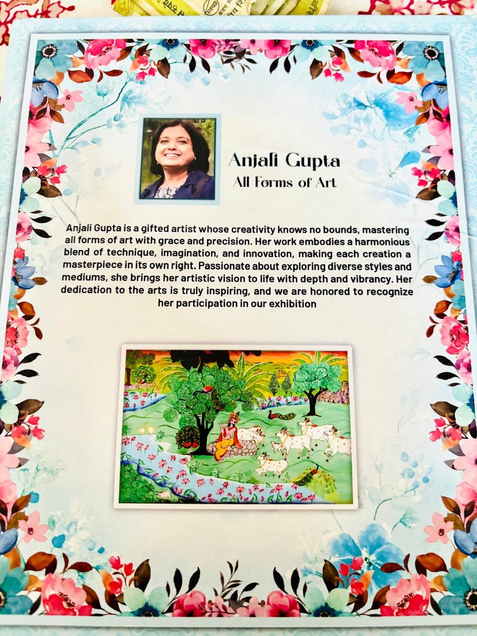 I am Anjali Gupta , a freelance contemporary artist who paints with heart, blends tradition and expression through acrylic colours. My work explores a wide spectrum—from abstract landscapes filled with emotion and energy to intricate Pichhwai art and serene paintings of Krishna and cows, rooted in spiritual and cultural symbolism.