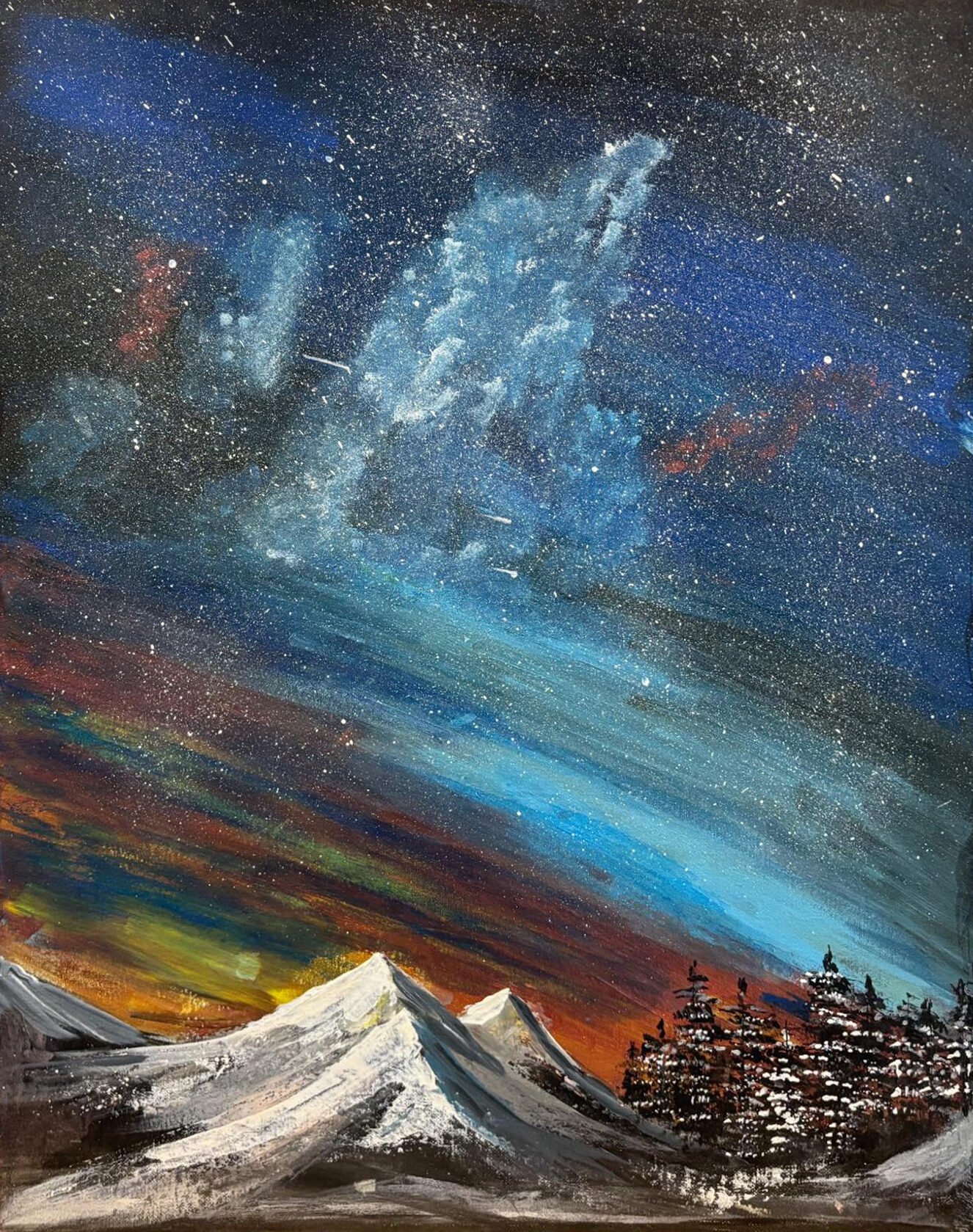 This painting shows majestic frozen mountains rise in silence beneath a vast sky ablaze with stars , where ribbons of northern lights dance in ethereal hues, casting a magical glow over the icy wilderness.