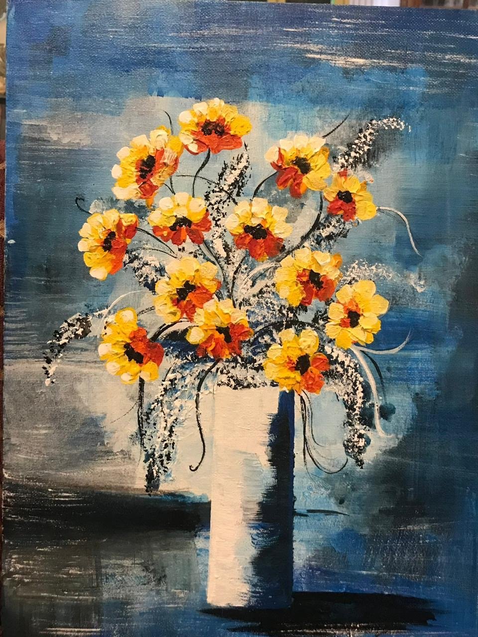 This painting shows a ceramic flower vase brimming with blossoms, set against an abstract background. The vibrant flowers bring life and freshness, while the abstract backdrop adds depth and artistic flair, highlighting the beauty of the arrangement.Medium- Acrylic on canvas