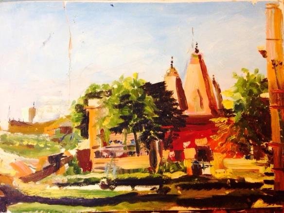 This painting depicts the village temples bathed in the soft light of morning.The rising sun casts a golden glow on the temple spires, while gentle rays filter through the trees around and the village awakens with a serene rhythm.The scene blends spirituality with the calm beauty of rural life.