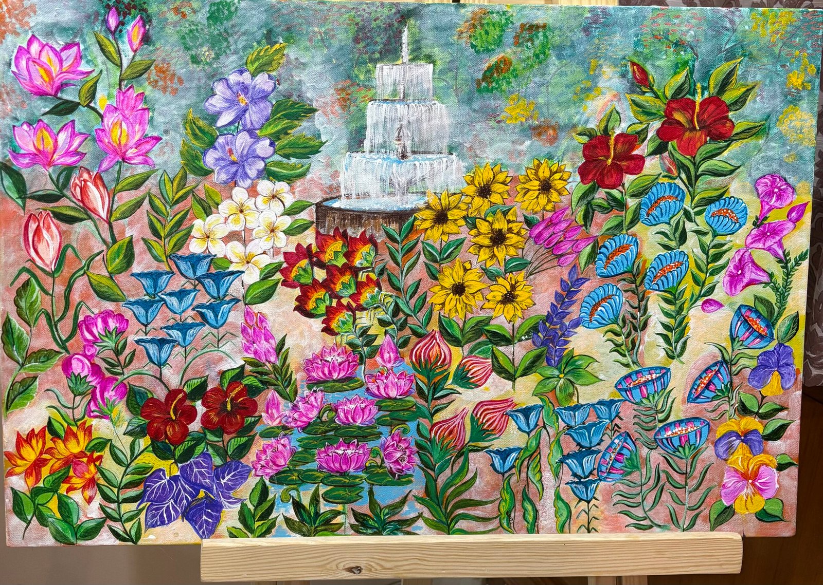 This painting is gentle burst of colors where different flowers bloom together, each with its own shape and shade, yet sharing the same light. The painting captures freshness, joy, and the quiet harmony of nature in full bloom. It’s acrylic on canvas.
